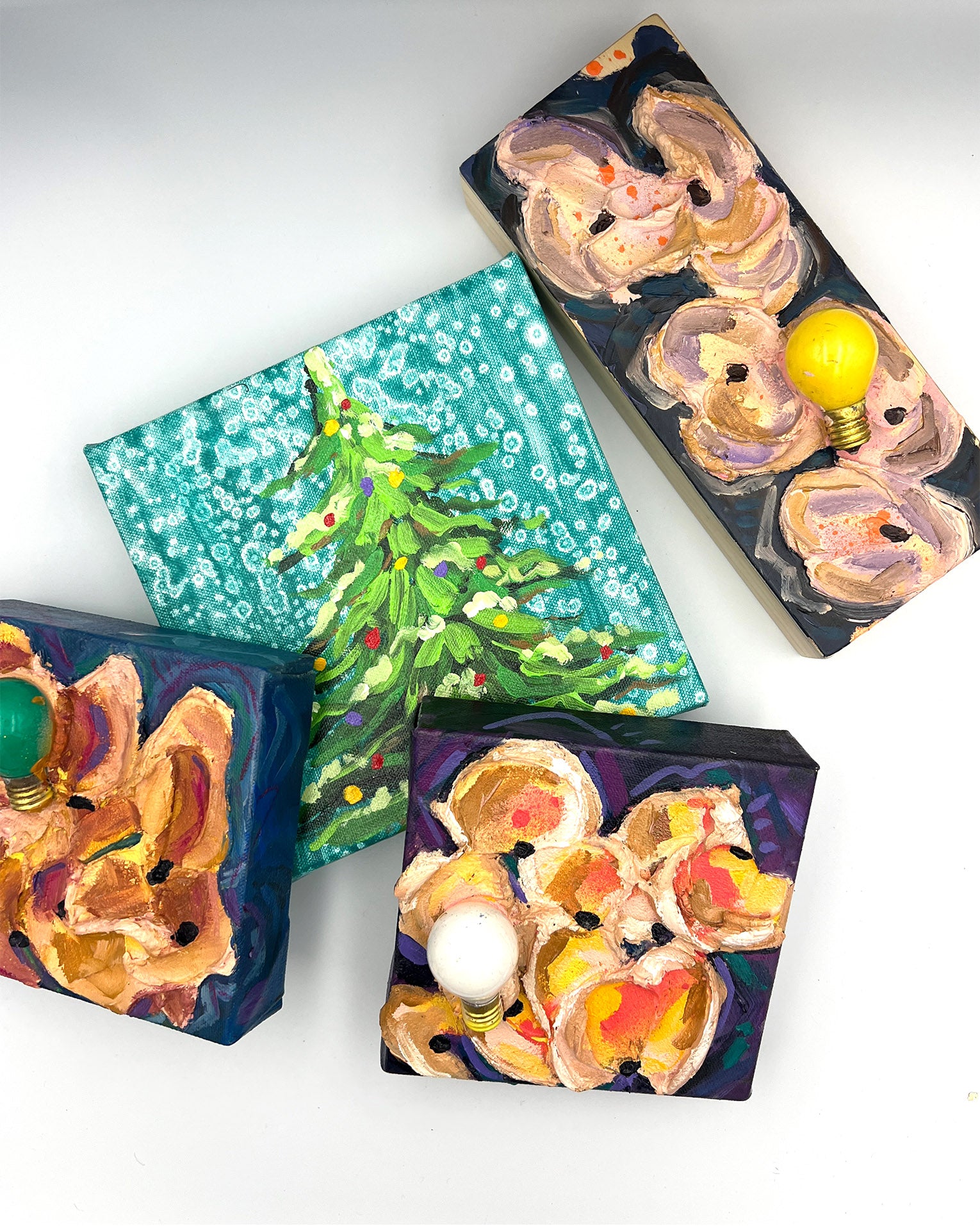 One-of-a-kind original, mixed media painting on wood. A bright acrylic painting created super thick texture with a Country Club Plaza light bulb nestled in the piece! Creating everlasting Holiday memories.
